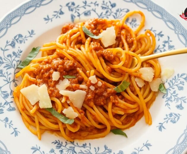 A rich tomato-based lentil bolognese served over pasta, topped with fresh basil and parmesan.