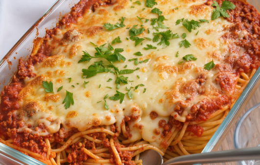 A comforting baked pasta dish layered with tender spaghetti, rich cream cheese, and a savory sauce. Oven-baked until creamy, bubbly, and lightly golden on top. Perfect for an easy family dinner or a cozy make-ahead