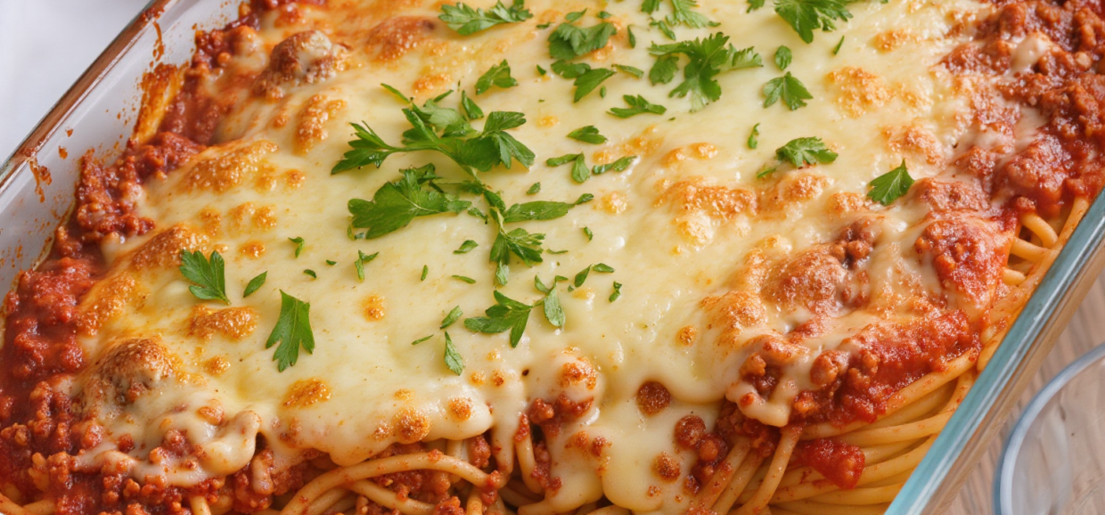 A comforting baked pasta dish layered with tender spaghetti, rich