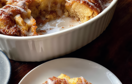 Warm, golden-brown baked dessert with soft, pull-apart pieces. Coated in cinnamon sugar and topped with a sweet, creamy glaze.