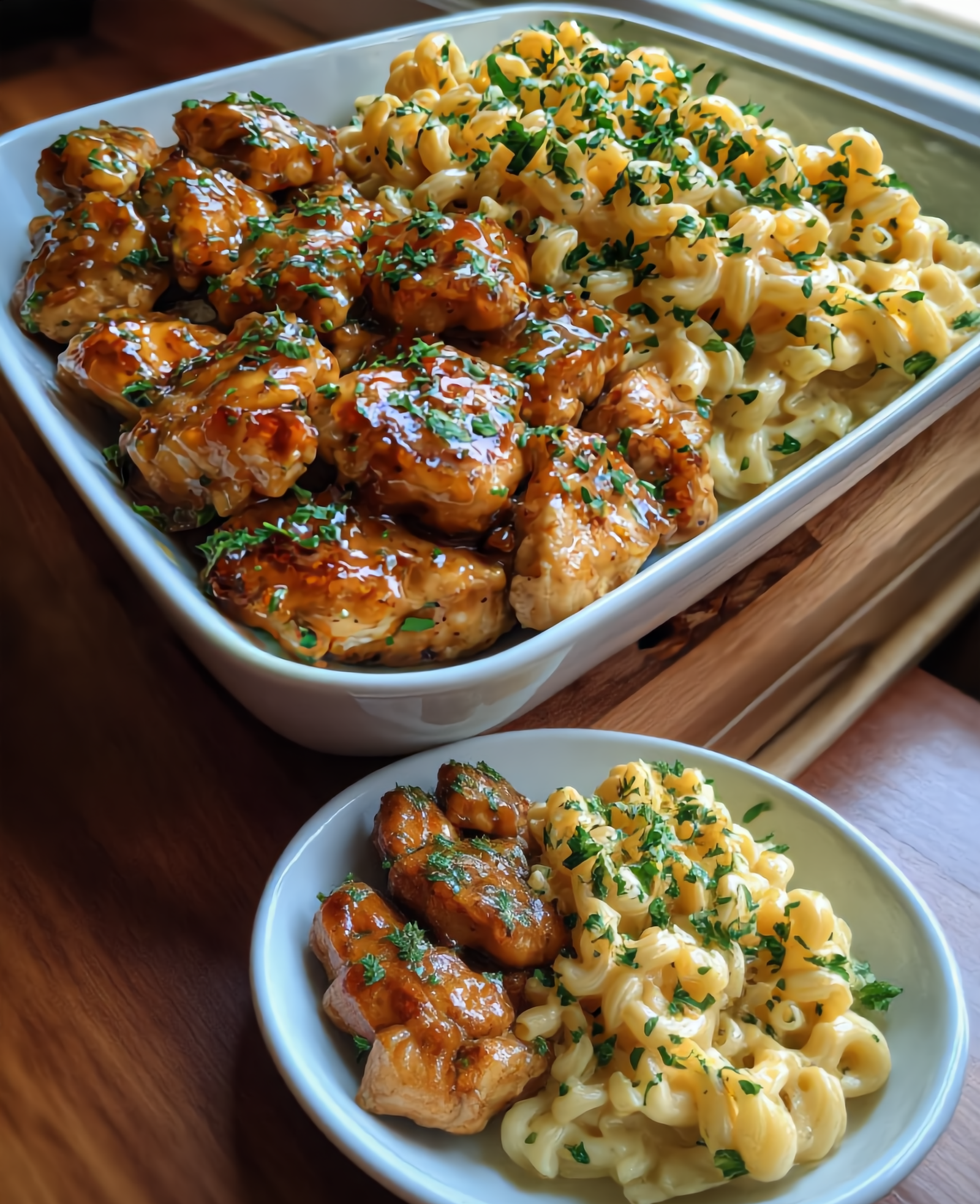 Put a big scoop of mac & cheese on each plate. Top with the honey garlic chicken. Sprinkle with fresh parsley for color. Enjoy while it’s hot and cheesy!
