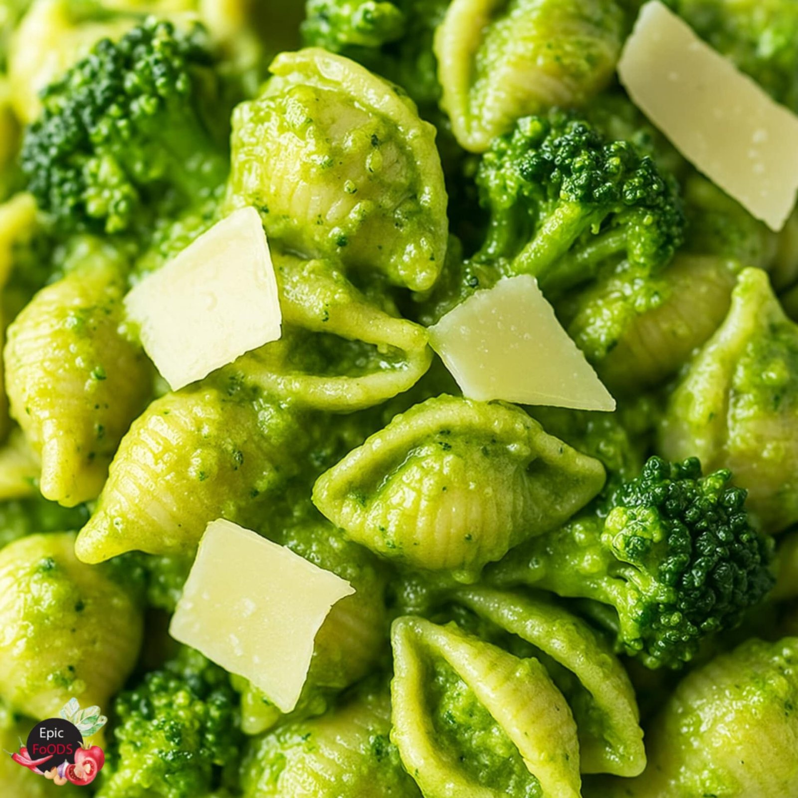 In the same broccoli water, cook 12 ounces of short pasta until almost done (1 minute less than package directions). Drain, saving 1 cup of the water. Add pasta to the broccoli sauce. Stir in ½ cup grated parmesan. Add a little pasta water until it looks glossy.