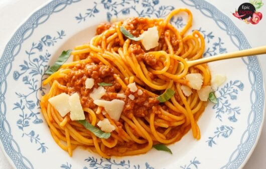 A rich tomato-based lentil bolognese served over pasta, topped with fresh basil and parmesan.