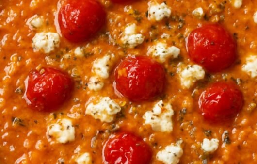 A close-up shot of creamy red lentil and tomato soup, topped with juicy cherry tomatoes and crumbled feta cheese. The